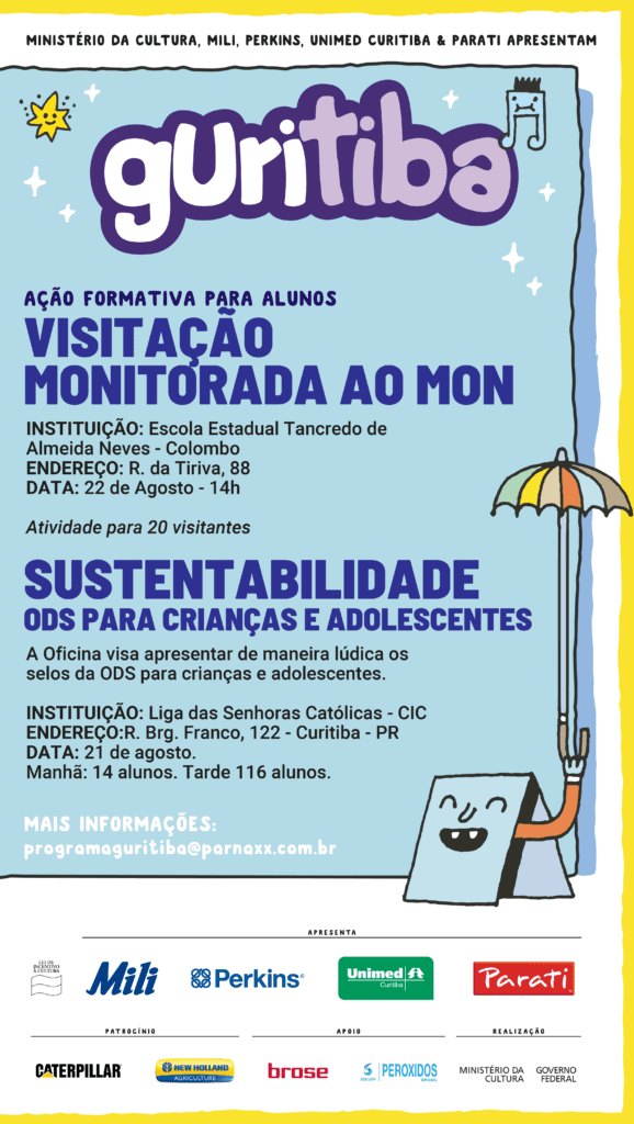 Se você tem interesse em levar o Guritiba até sua instituição gratuitamente, ou gostaria de inscrever seu projeto educativo no programa, acesse aqui.