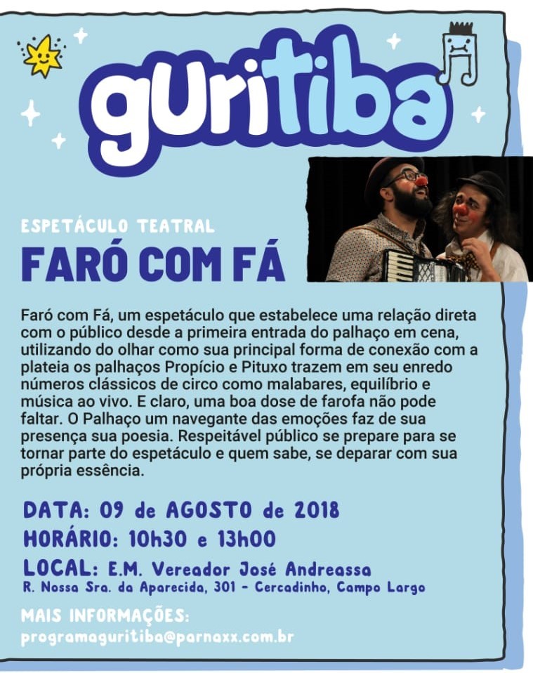 O Guritiba é especialmente pensado para as crianças e funciona em dois momentos: durante o Festival de Teatro, com vários espetáculos infantis e atividades recreativas, e também, ao longo do ano, levando peças teatrais e oficinas a escolas de toda a cidade e região metropolitana.