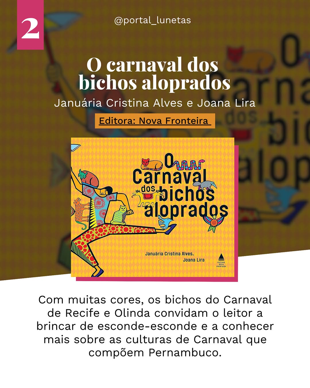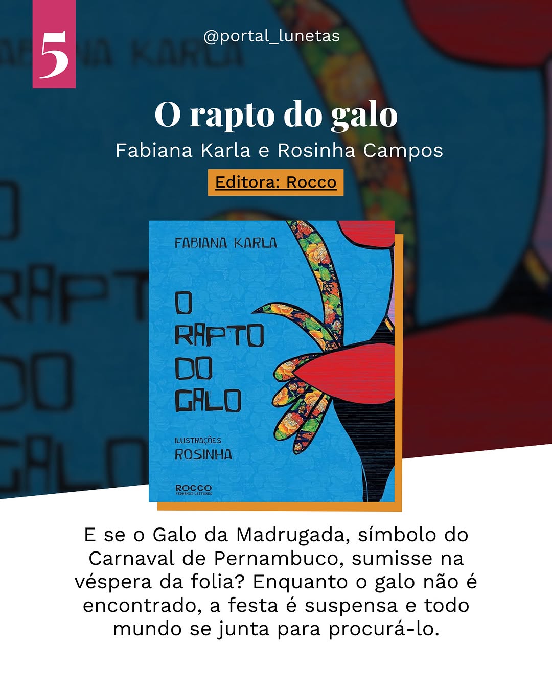 No livro de estreia de Fabiana Karla, o Galo da Madrugada, símbolo do famoso bloco carnavalesco de Recife, desaparece às vésperas do Carnaval. Com o Momo se recusando a abrir a festa, personagens folclóricos como o Homem da Meia-Noite, a Mulher do Dia e os bonecos de mestre Vitalino se unem para encontrá-lo. Em um cordel contemporâneo, enriquecido com as ilustrações de Rosinha, a história celebra o folclore pernambucano e a cultura popular, culminando em um plano infalível do Cirandeiro para salvar a festa.