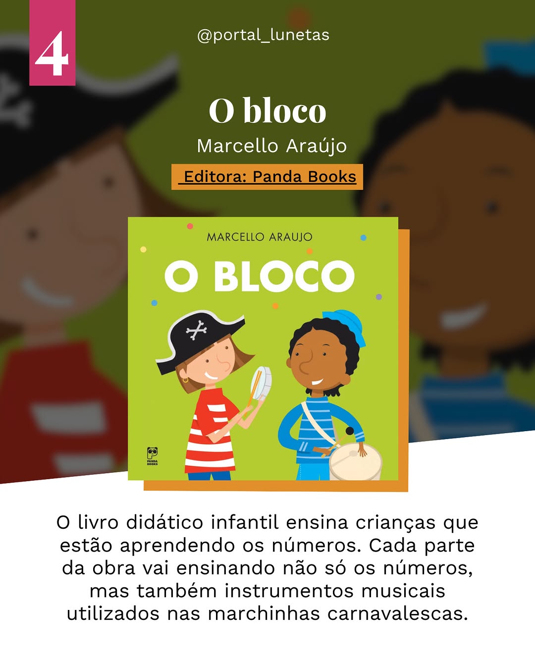 Enquanto o Carnaval, uma das maiores festas populares do Brasil, ainda não chega, a festa ganha vida no livro O bloco, de Marcello Araujo. Voltado para crianças em fase de aprendizado dos números, o livro faz uma contagem de 1 a 10, apresentando os instrumentos musicais típicos das marchinhas carnavalescas, como surdo, agogô, pandeiro e tamborim. De forma lúdica e divertida, a obra ensina os pequenos a contar enquanto os introduz ao ritmo e à alegria do Carnaval.